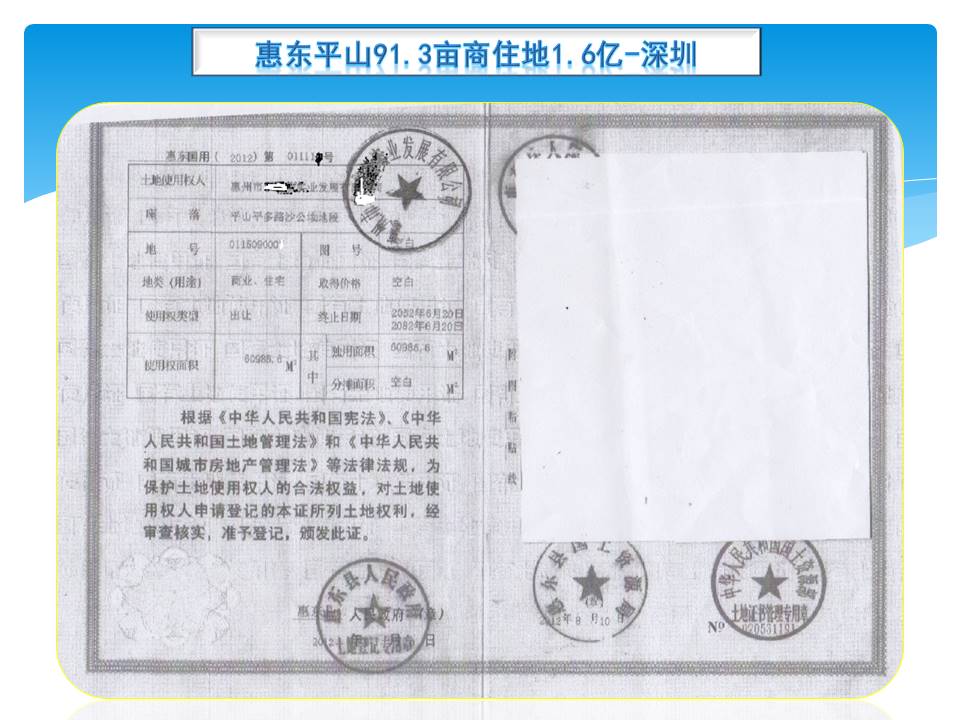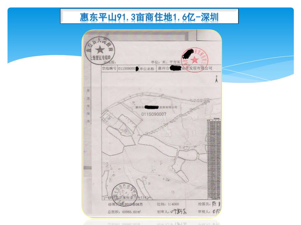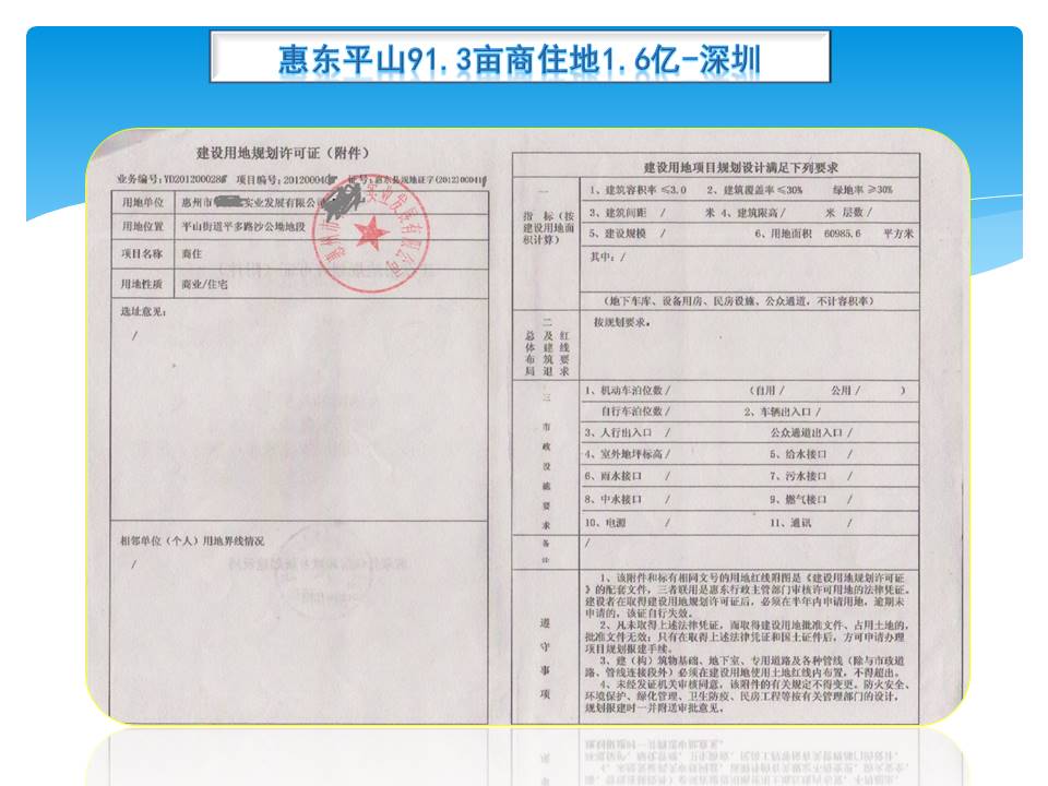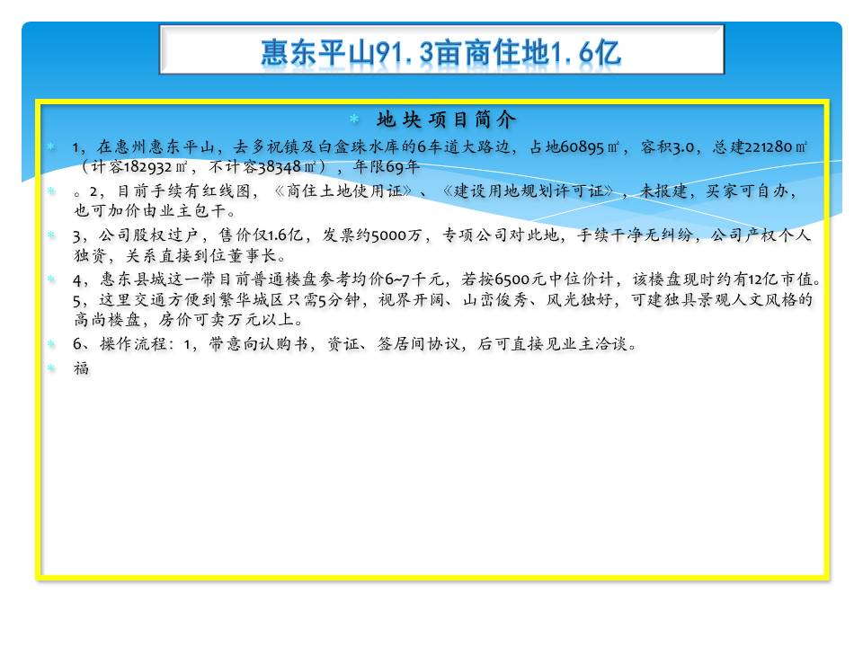 *1,在惠州惠东平山,去多祝镇及白盒珠水库的6车道大路边,占地60895㎡,容积3.0,总建221280㎡(计容182932㎡,不计容38348㎡),年限69年