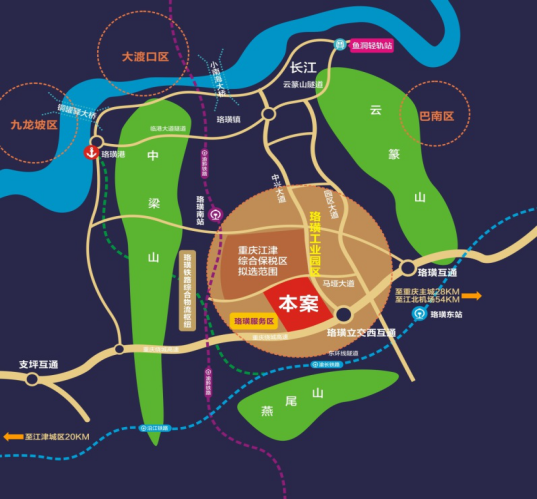 该位置地理优越,交通便利,珞璜工业园江津综合保税区旁,与珞璜工业园-“重庆江津综合保税区”一街之隔,紧邻重庆绕城高速珞璜服务区(绕城高速珞璜西互通下道口)和珞璜铁路综合物流枢纽,园区拥有珞璜港千万吨级深水良港,并有铁路专线连接珞璜综合物流枢纽,可以有效实现“公路、铁路、水路”多式联运。
